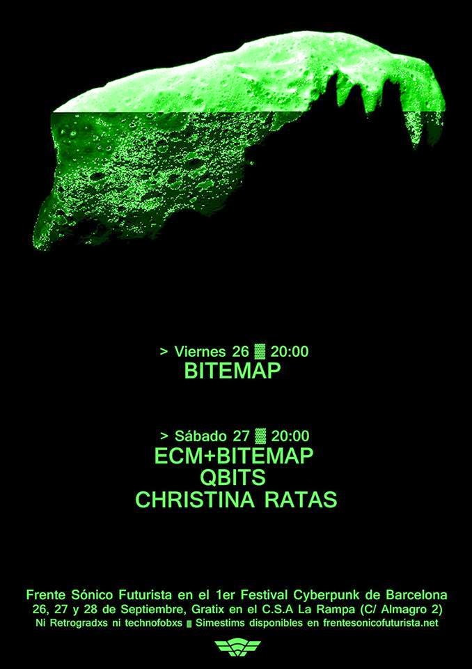 Actuación de Qbits y pinching de Sandroide en el 1er Festival CYBERPUNK de Barcelona, junto a ECM+BITEMAP y Christina Ratas, el sábado 27 de septiembre dentro de la programación de actividades del Frente Sónico Futurista. En la planta de moda, Futique tendrá merchan de Qbits. De 11 a 24 horas en el C.S.A La Rampa con la colaboración de 1m+kLadyDi.